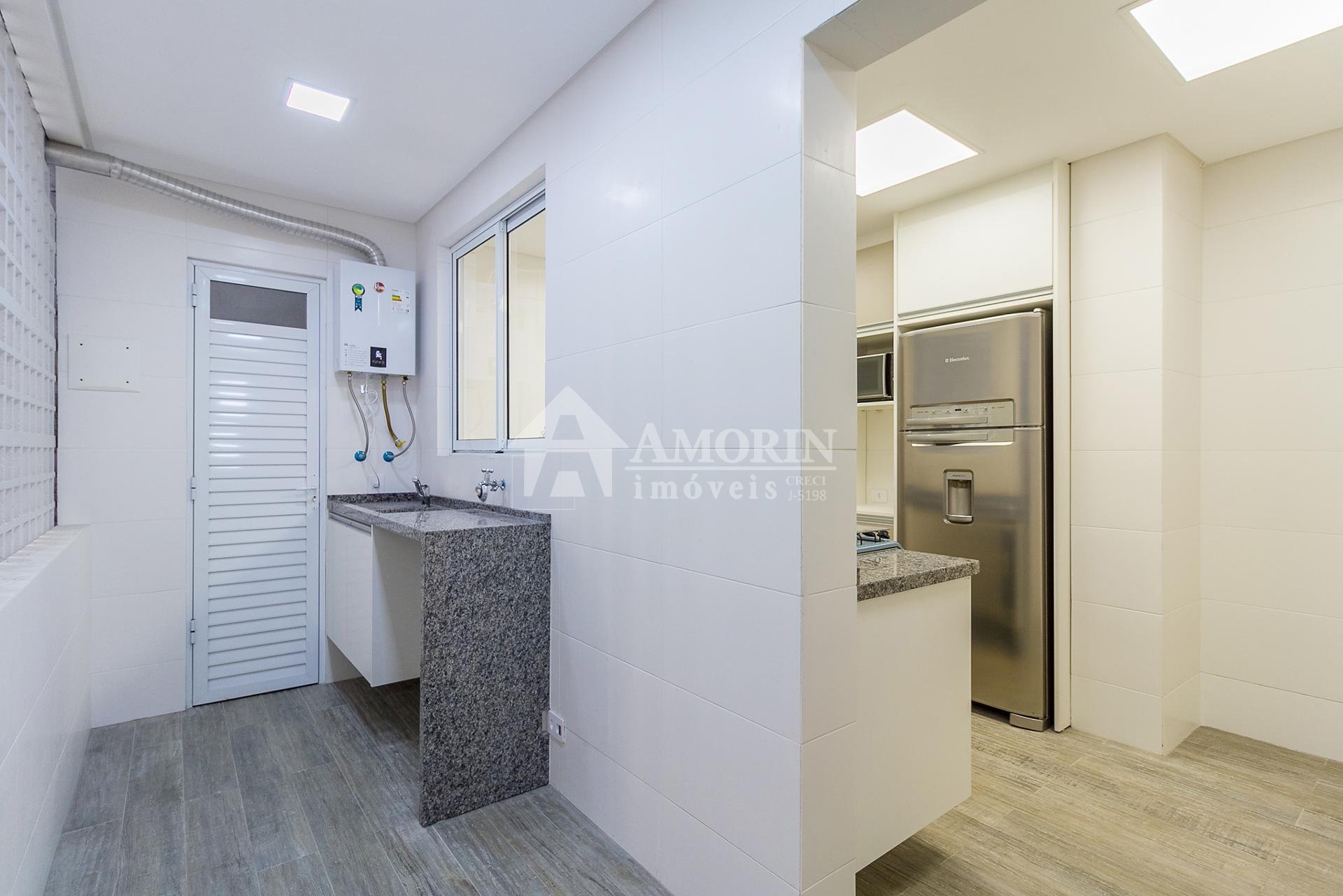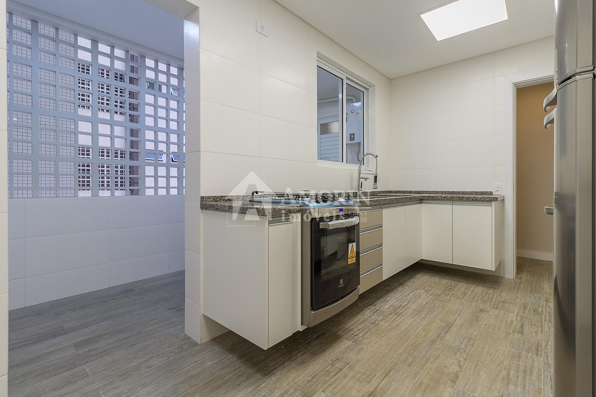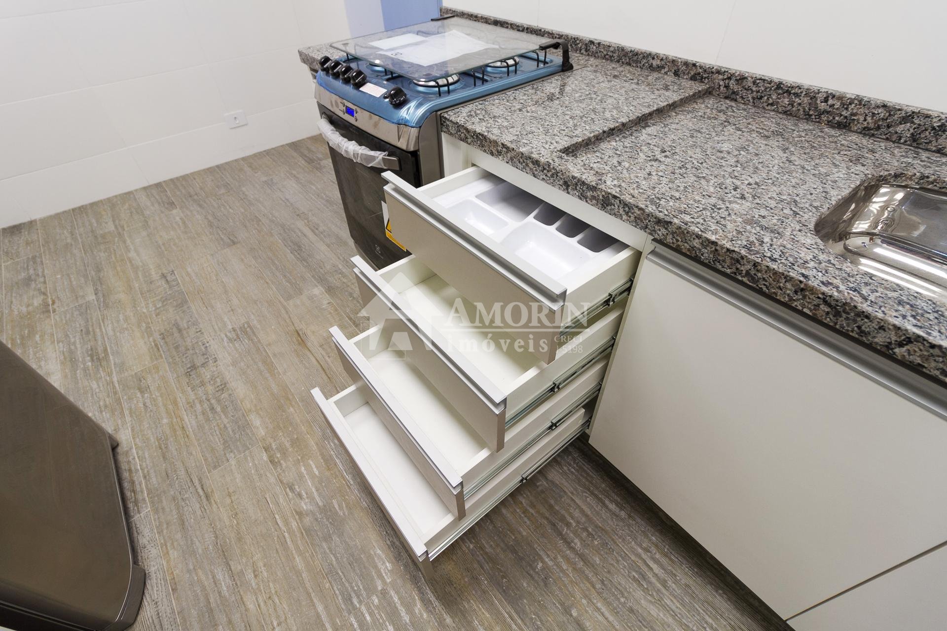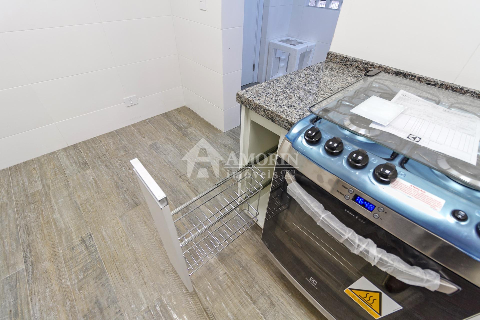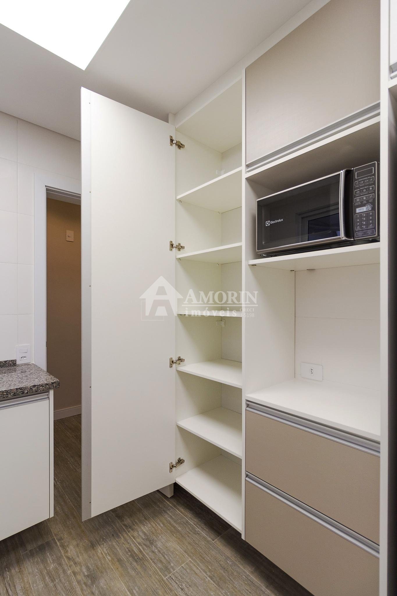 Com 101,42 m² de área privativa, o imóvel é bem ventilado e iluminado. Possui três quartos, sendo uma suíte com armários planejados, além de sala integrada, lavabo e cozinha equipada com armários.