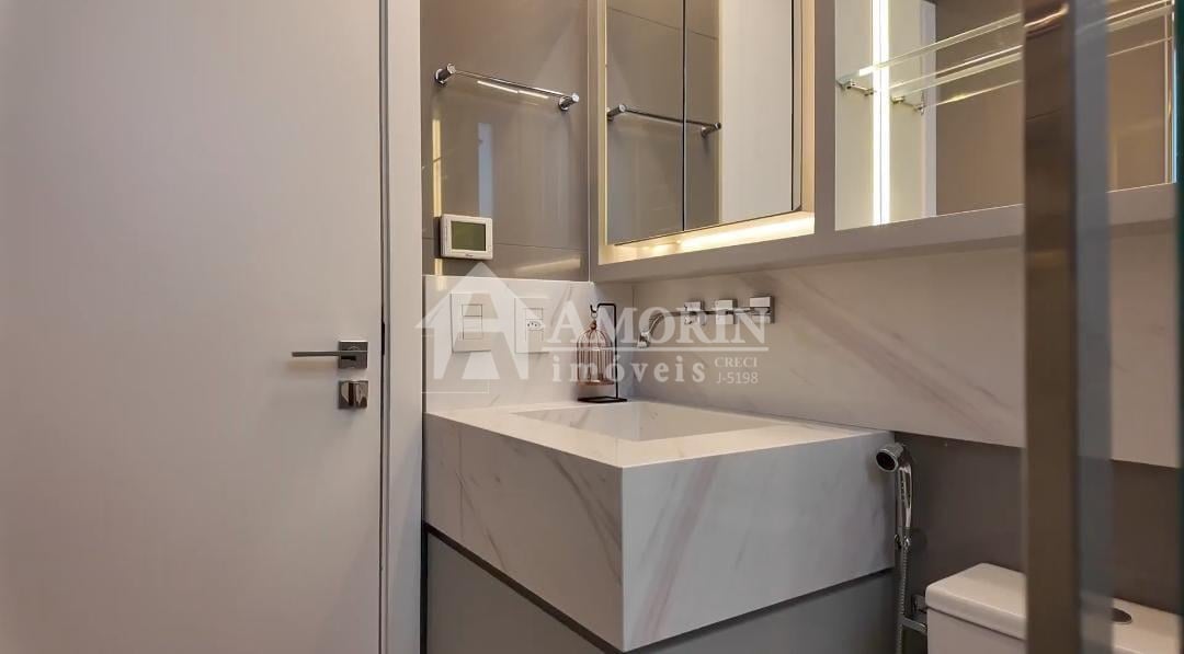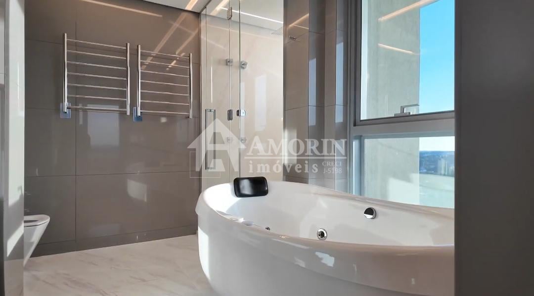 Acabamentos Distintos: Piso aquecido Hotfloor, móveis decorativos de grife, como Ton Sour e Artefacto, e mármores Griss Armani e Onyx.