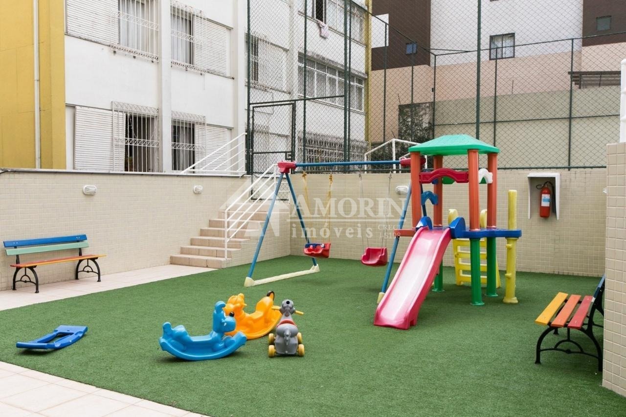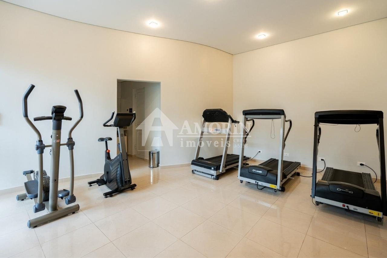 A infraestrutura do condomínio garante opções de lazer e segurança. O hall de entrada, com duas portas de vidro, dá acesso a áreas comuns que incluem piscina, sauna, espaço fitness, playground, quadra esportiva em gramado, salão de festas com churrasqueira, espaço gourmet com churrasqueira e salão de jogos. O condomínio oferece também caldeira, portaria e vigilância 24 horas com guarita e depósito de encomendas, além de elevador, jardim e interfone.