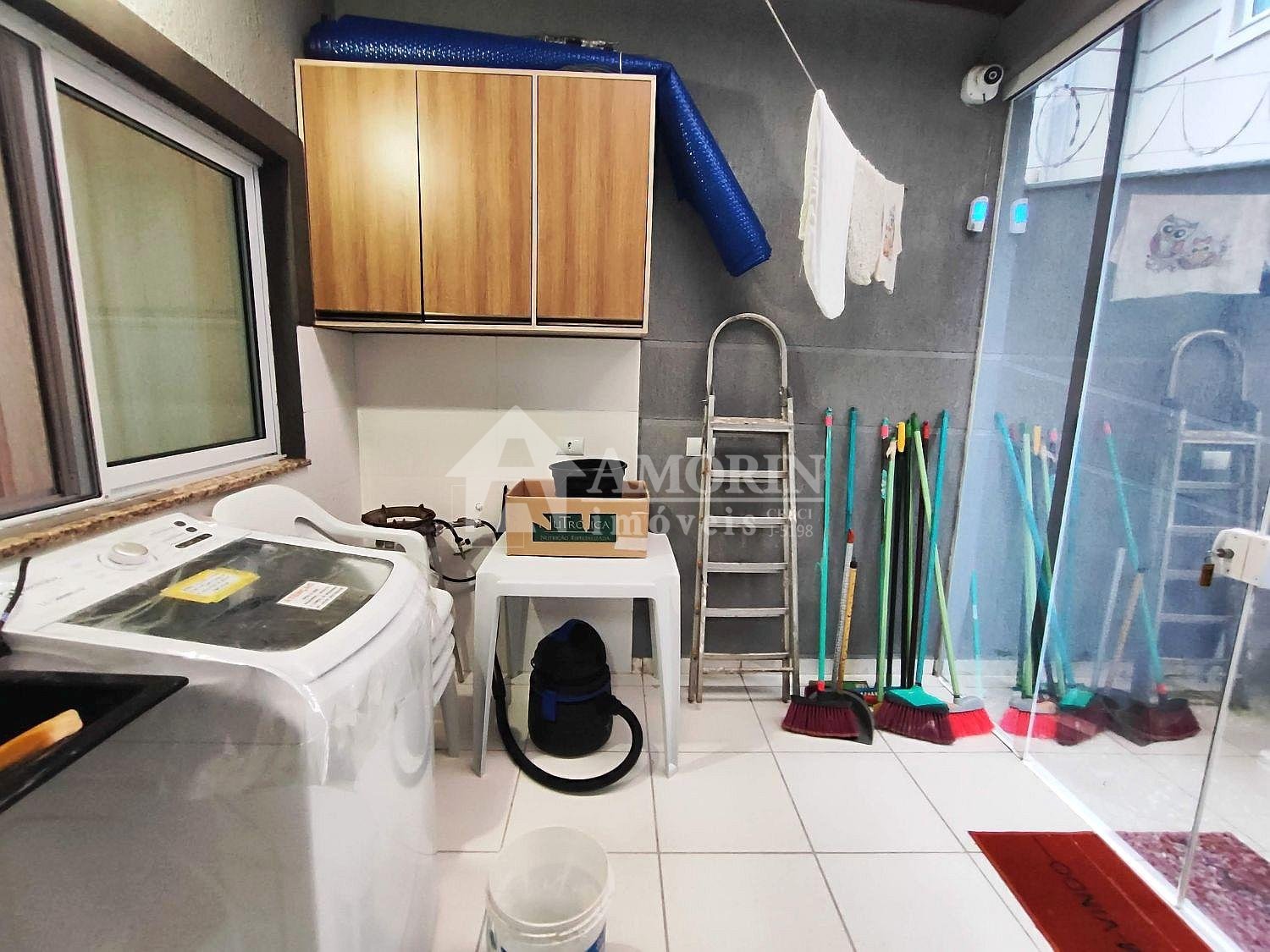 Excelente sobrado, pronto para morar, com 3 quartos (1 suíte), 2 com sacada e ar condicionado, sala integrada à copa com churrasqueira e piscina. Cozinha planejada, 3 banheiros modernos, área de serviço e 1 vaga de garagem coberta + 1 estacionamento em frente.