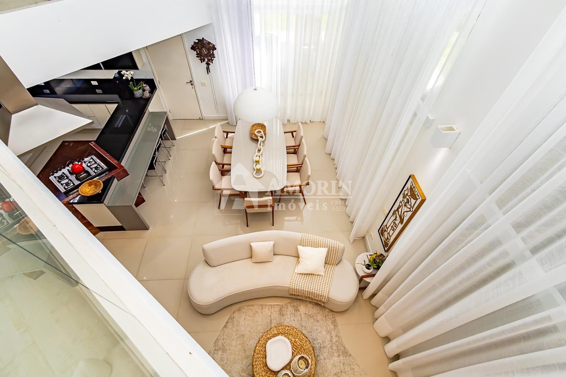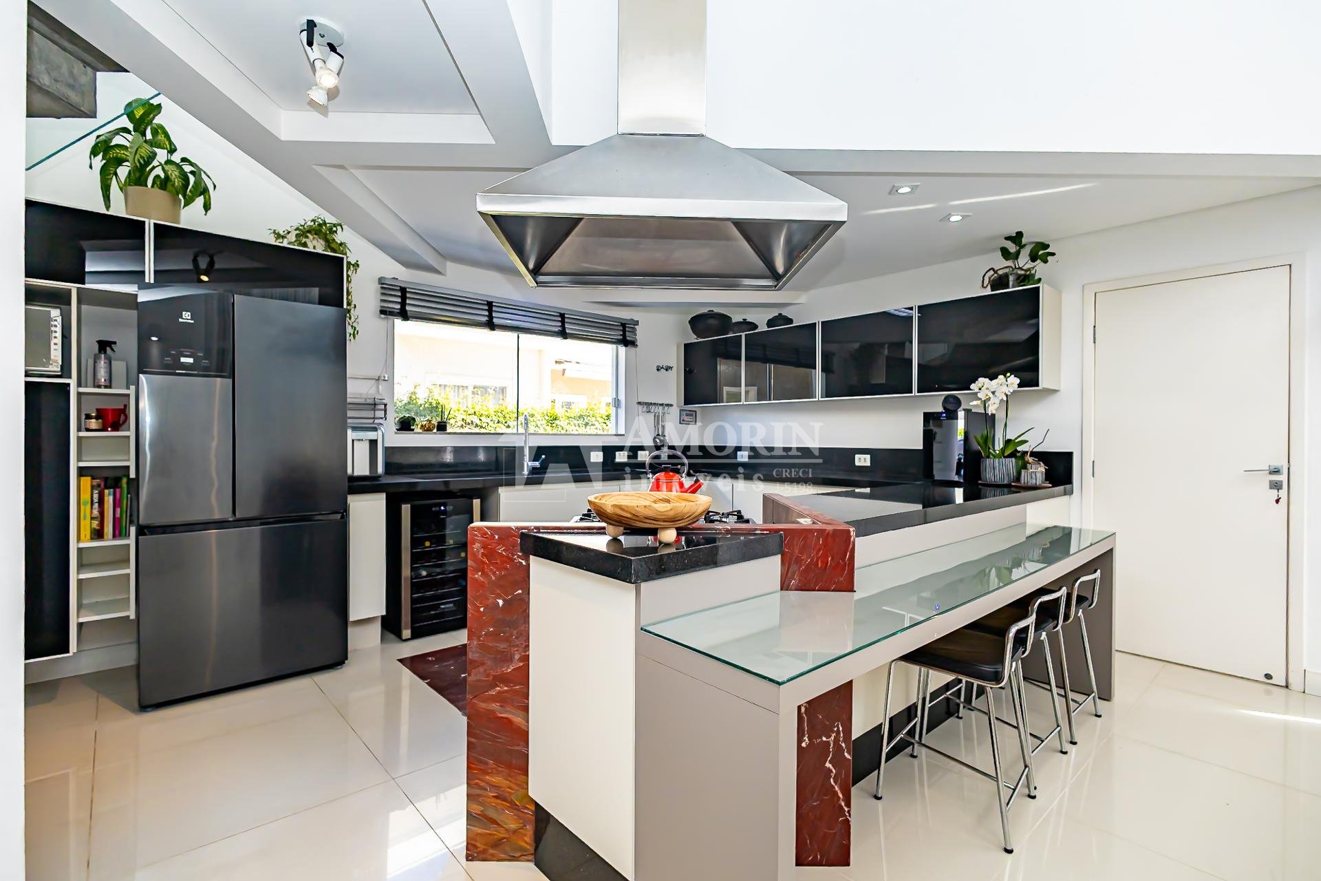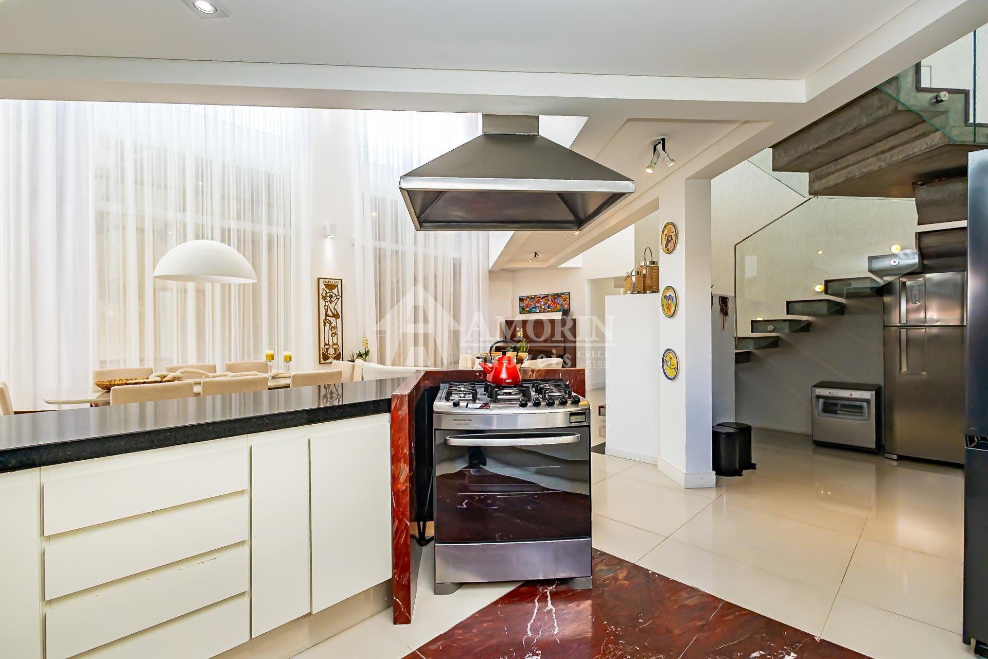 A cozinha, totalmente planejada e integrada, se conecta de forma harmoniosa à sala de jantar e à área gourmet com churrasqueira a carvão, um espaço que se integra de maneira independente tanto à sala quanto ao quintal, criando diferentes possibilidades de convívio.