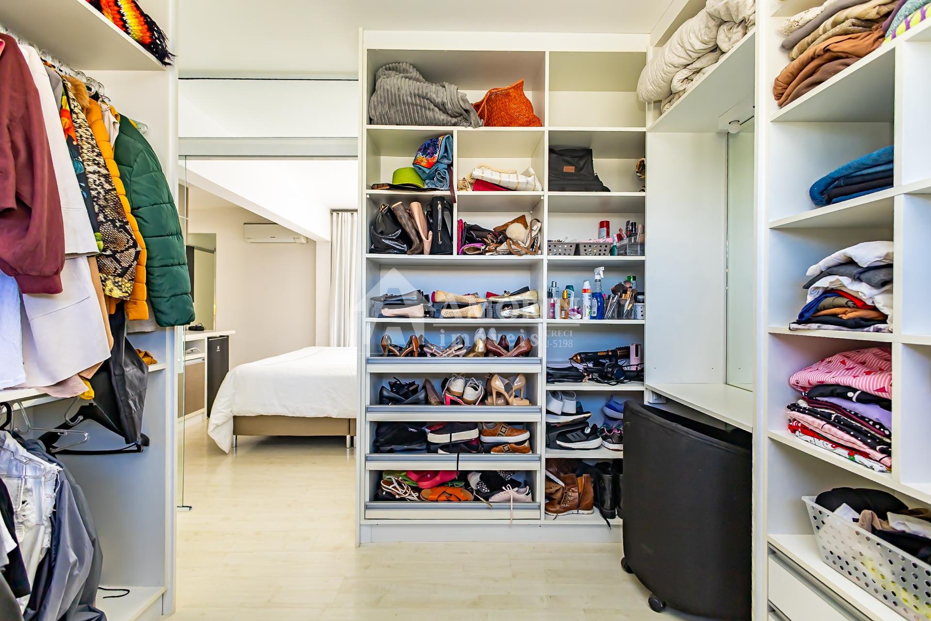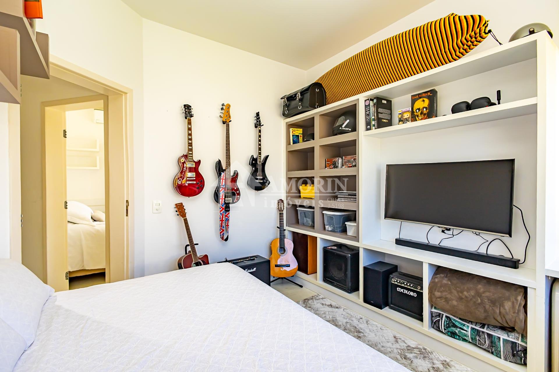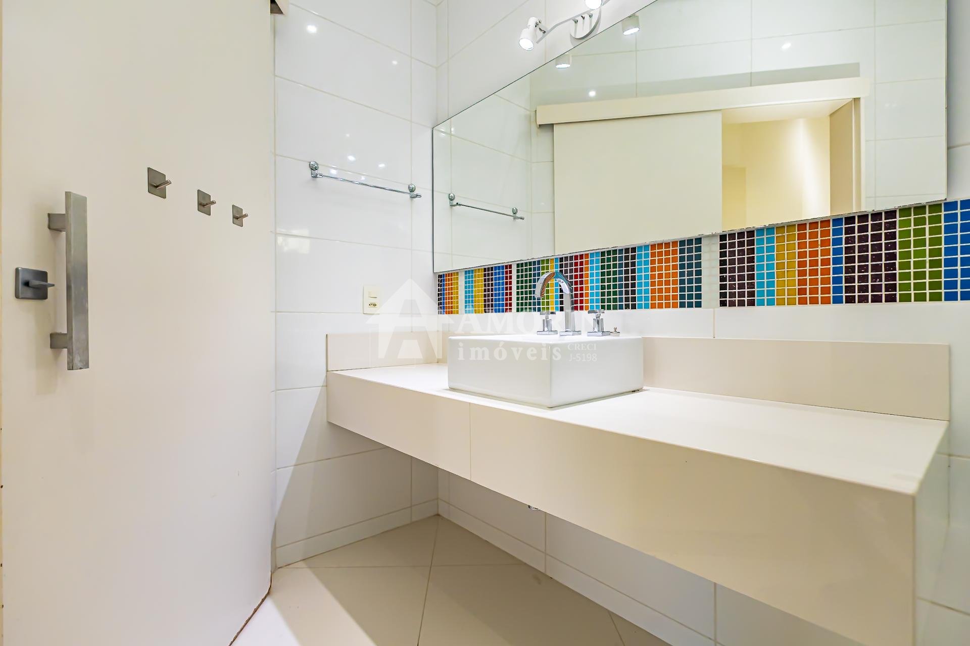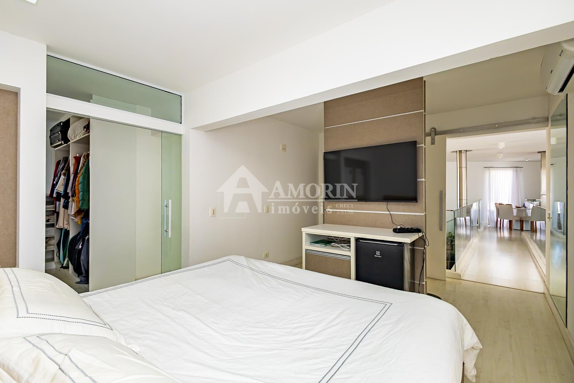 No pavimento superior também está a suíte master, que se destaca pelos dois closets independentes senhor e senhora e por um banheiro amplo, muito bem iluminado, com uma elegante banheira de imersão.