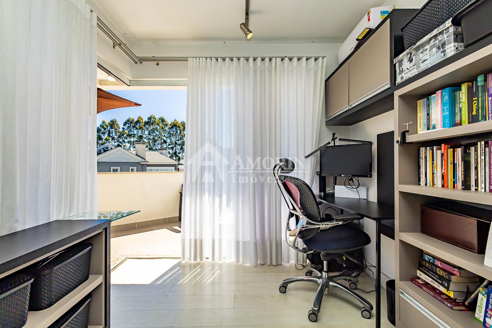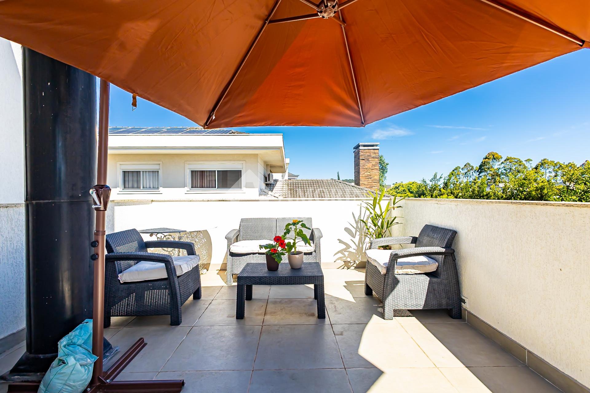 Subindo as escadas, surge um ambiente de convivência perfeito para reunir a família, equipado com televisão, área para jogos e um escritório com uma bela sacada, onde móveis externos convidam a aproveitar os dias de sol.