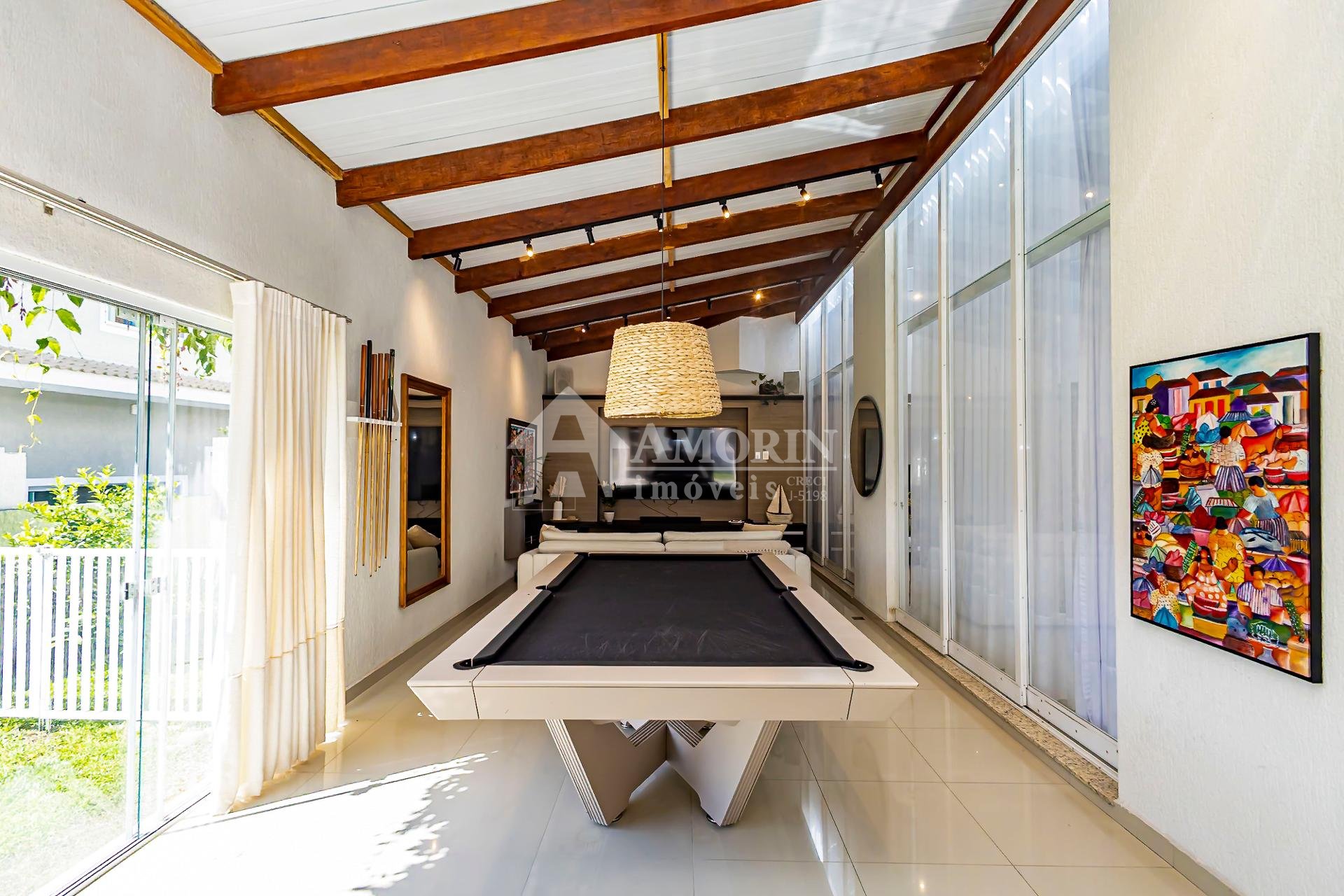 Na lateral, um ambiente especial reúne uma mesa profissional de sinuca e uma área de home para assistir televisão e relaxar, complementando a atmosfera de lazer que permeia toda a casa.